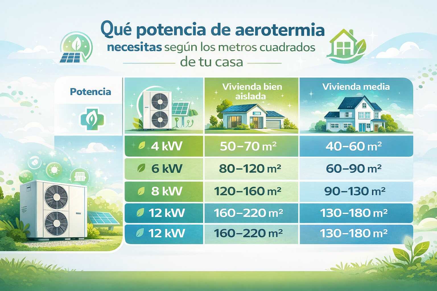 Si quieres conocer en detalle qué potencia de aerotermia necesito, puedes consultar esta guía completa que explica cómo calcularla correctamente