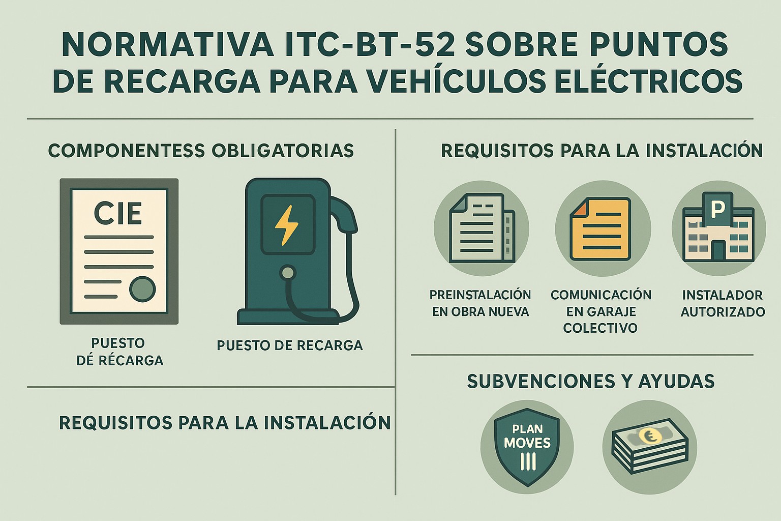 La ITC-BT-52 (Instrucción Técnica Complementaria del Reglamento Electrotécnico de Baja Tensión) es la norma que regula todas las instalaciones destinadas a la recarga de vehículos eléctricos en España.