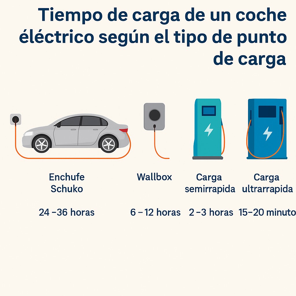 Un enchufe doméstico (2,3 kW) puede tardar toda la noche, mientras que un punto ultrarrápido (350 kW) puede recuperar hasta 300 km de autonomía en menos de 20 minutos.