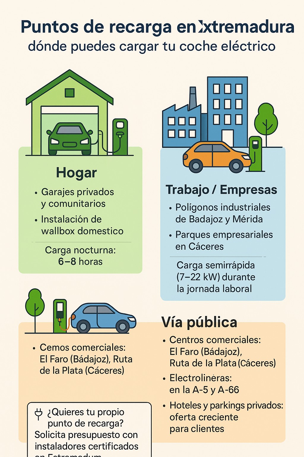 👉 Contacta ahora con nuestros instaladores de puntos de recarga para coches eléctricos en Extremadura y solicita tu presupuesto gratuito.